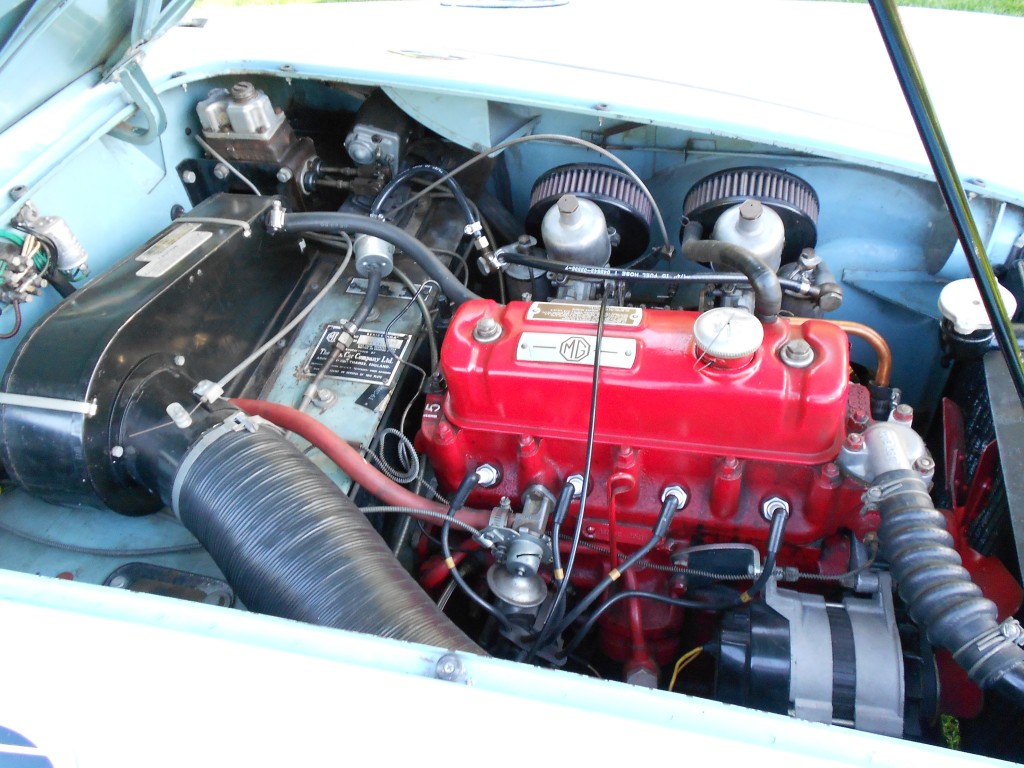 Engine No. 16GA-U-20214. You may note the alternator installed replacing the original generator for drive-ability. However, we have the original generator from the car if one wishes to go back. The car is also now a single 12v battery as the original configuration was twin 6 volt batteries. Again, the carrier for the additional six volt battery was left in place and the single 12v resides in the other. This could be reconfigured back easily as well. You may also have noticed the “15” cast into the rear of the head. What’s this?! I thought this was supposed to be an original 1600 engine. We researched this and found that quite a few of the early 1600 engines used the 1500 (“15”) heads; these heads were machined for the larger valves and affixed to the 1600 blocks (cast with “1600” on the left front side of the blocks) – as found on this engine. Not unusual for MG or other Brit car builders when switching assemblies for new models (and after reading of the number of assembly locations that were used to manufacture each and every Bug Eye or Frog Eye Sprite I can even better understand this!)
