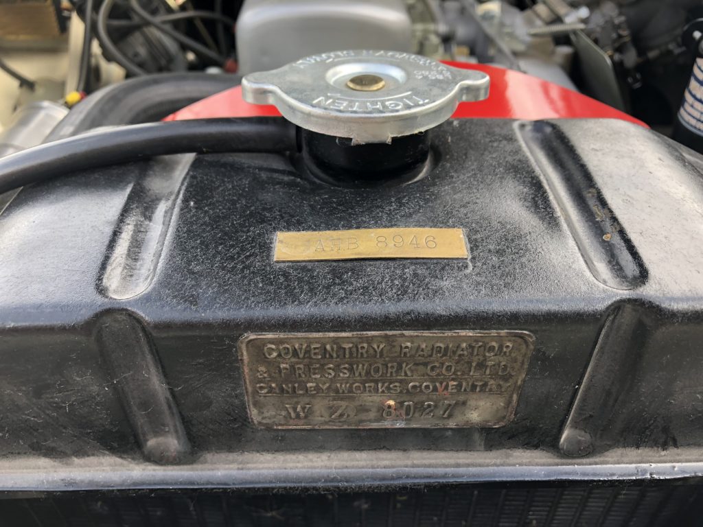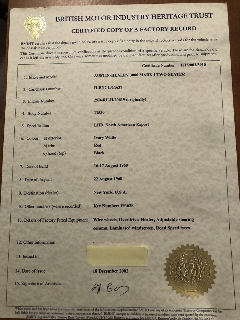We can see from the Heritage Trust Certificate (shown below and included with the car) that the car was originally equipped with a four speed transmission with overdrive (as it is now, albeit with a center shift transmission, not the original side shift).