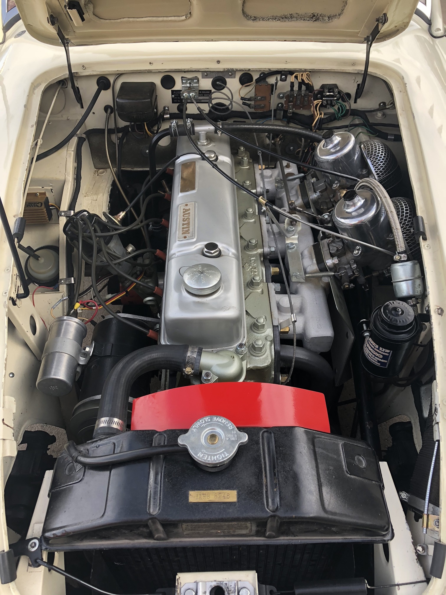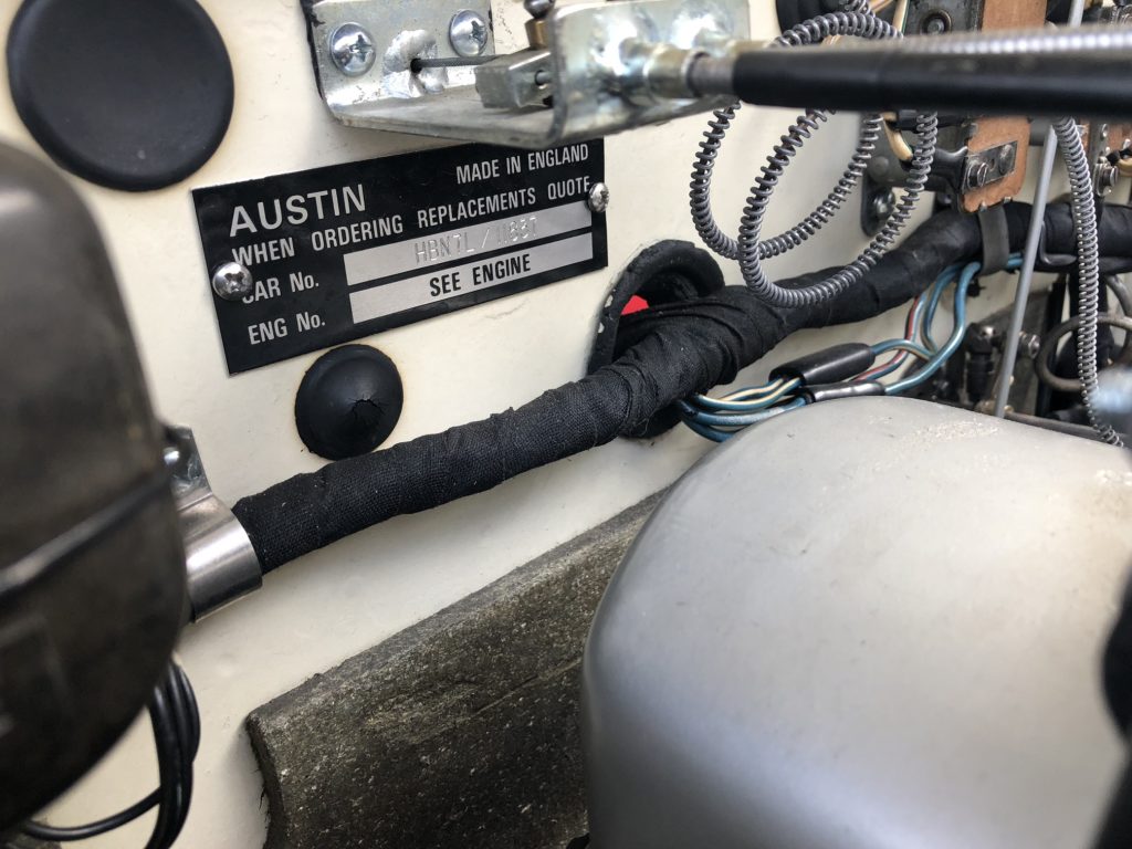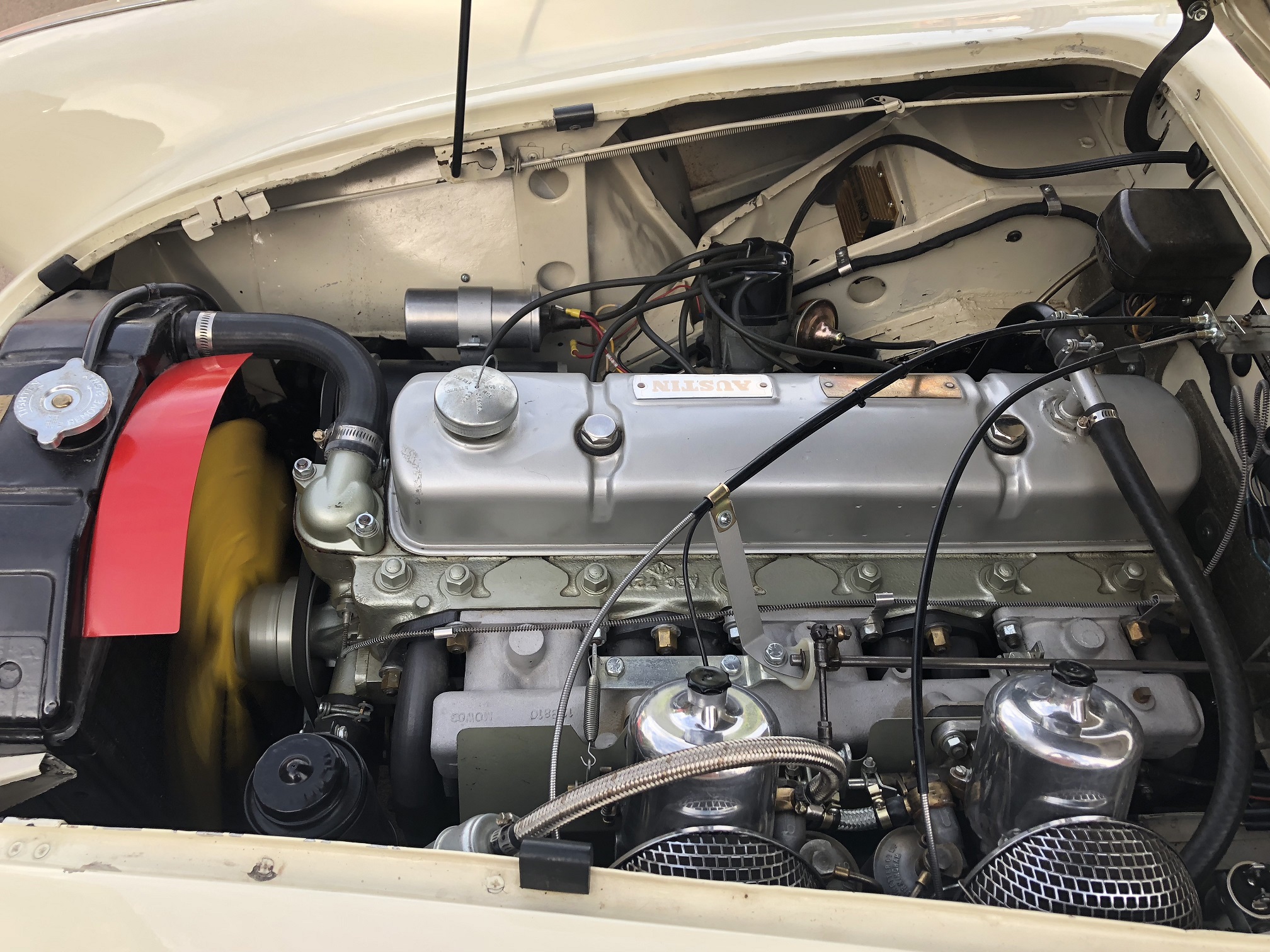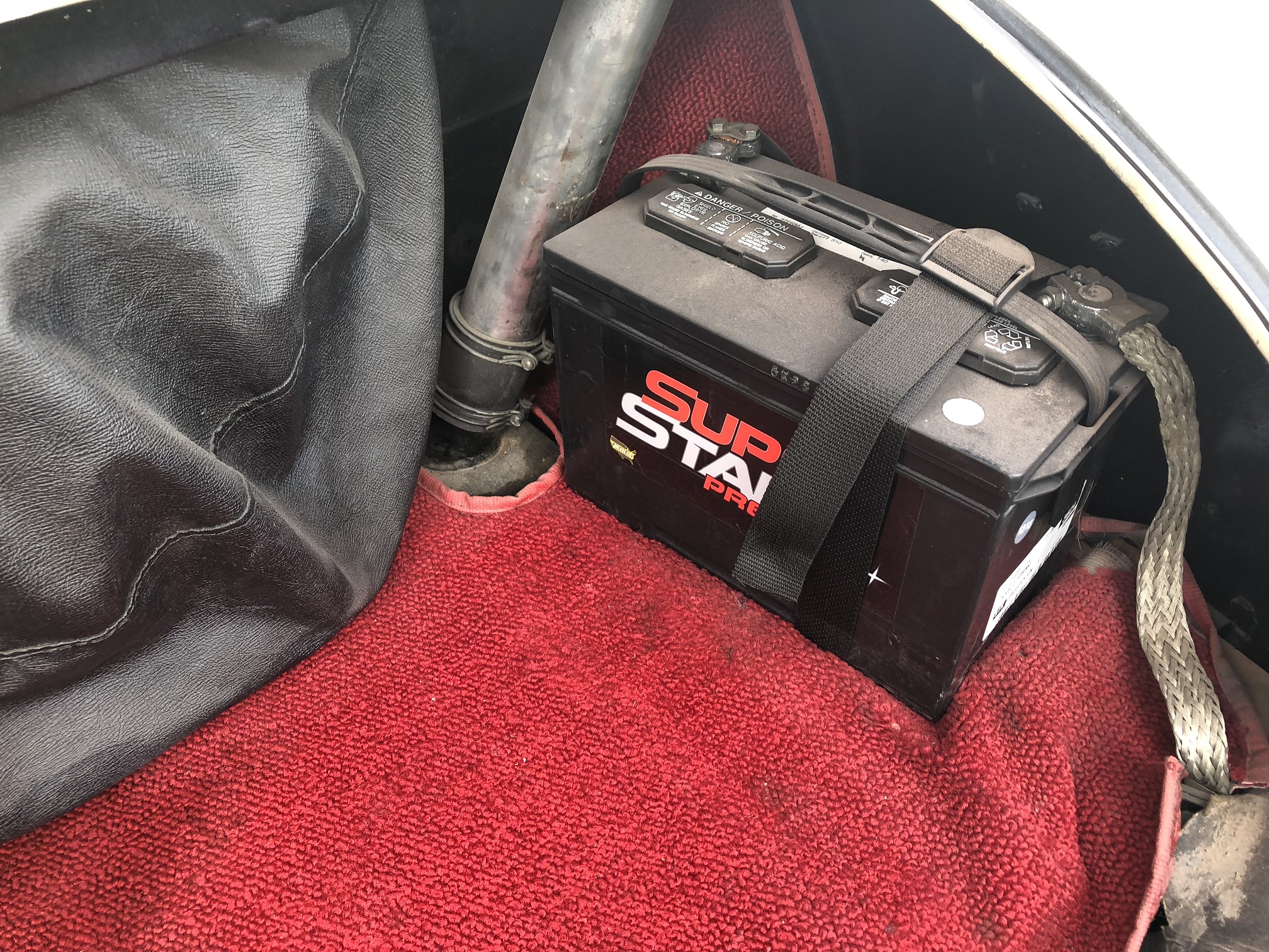 Another practical modification is use of a single 12v (positive earth) battery located in the boot as were later Healeys. The original battery configuration used two 6v batteries mounted beneath the floor behind the seats (6v batteries for the car are still available if desired).