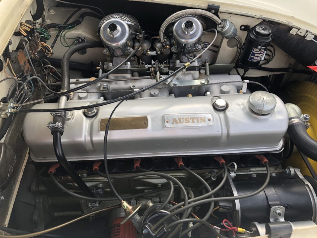 2,912 cc in-line six cylinder engine with twin HD8 SU carbs. The original engine in the car was replaced at some point with another Healey 3000 engine; engine# 29KF/RU/H269 which decodes as an engine from a 1963-68 BJ8, with overdrive (R) and center floor shift (U), high compression (H), production # 269. This engine produces 150 HP (an increase of 26 HP over the original engine) at 5,250 RPM and 173-lb.ft. of torque at 3,000 RPM.